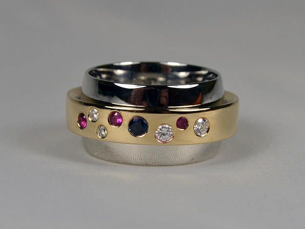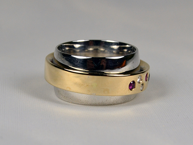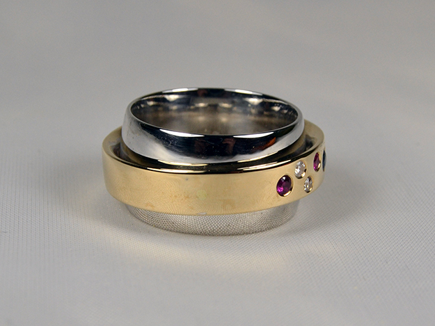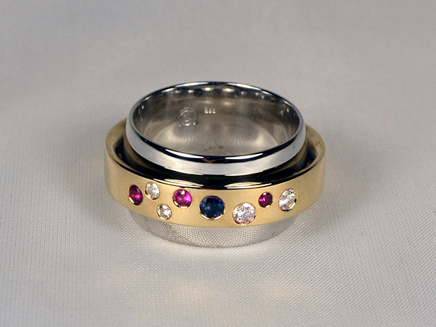 Breiter Weißgoldring mit beweglich montiertem Gelbgoldring, in den Saphire, Brillanten und Rubine aus Kundenbeständen gefasst sind.