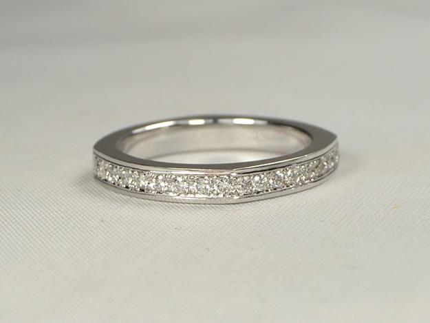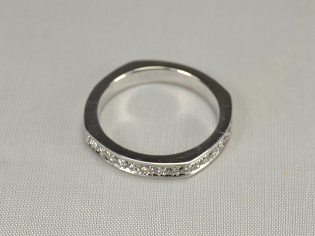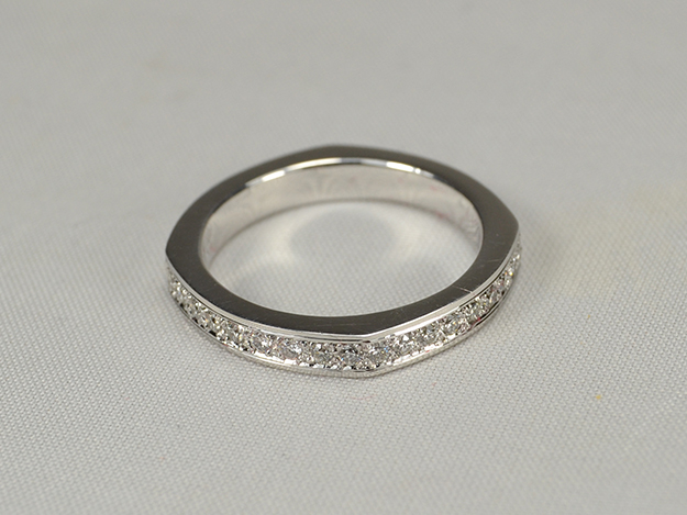 Schmaler Ring in Weißgold, außen leicht viereckige Form. Über Eck mit Brillanten pavéausgefasst.