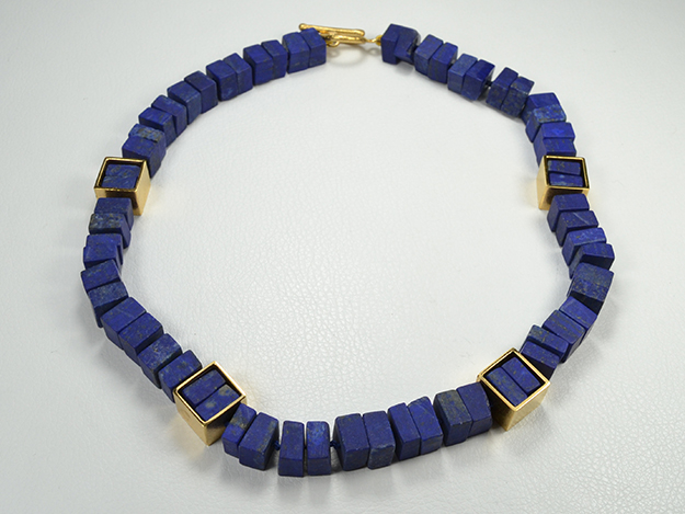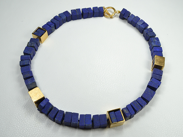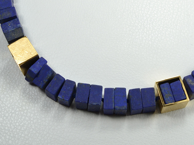 Scheiben in Lapis Lazuli zu Würfeln kombiniert mit Zwischenteilen und Schließe aus Silber, feingoldplattiert.