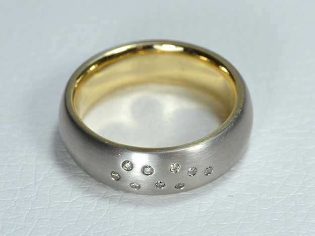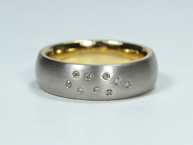 Innen ein Gelbgoldring, außen ein Weißgoldring mit 10 cognacfarbenen Brillanten.