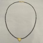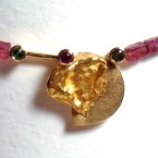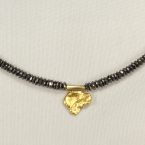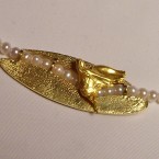 10.000 Flitterchen ergeben ein Gramm, was bedeutet, dass die Kleinstteilchen von einem Feingehalt von 922/000 – 927/000, erst einmal zusammen geschmolzen werden müssen. Beim Abgießen des flüssigen Goldes in Wasser entstehen die bizarren und die Fantasie anregenden Formen, welche mich dazu veranlassten, sie wie einen Edelstein als Zentrum in das Schmuckstück zu setzen und den Entwurf nach dem zu richten, was ich in der Form entdecken konnte.